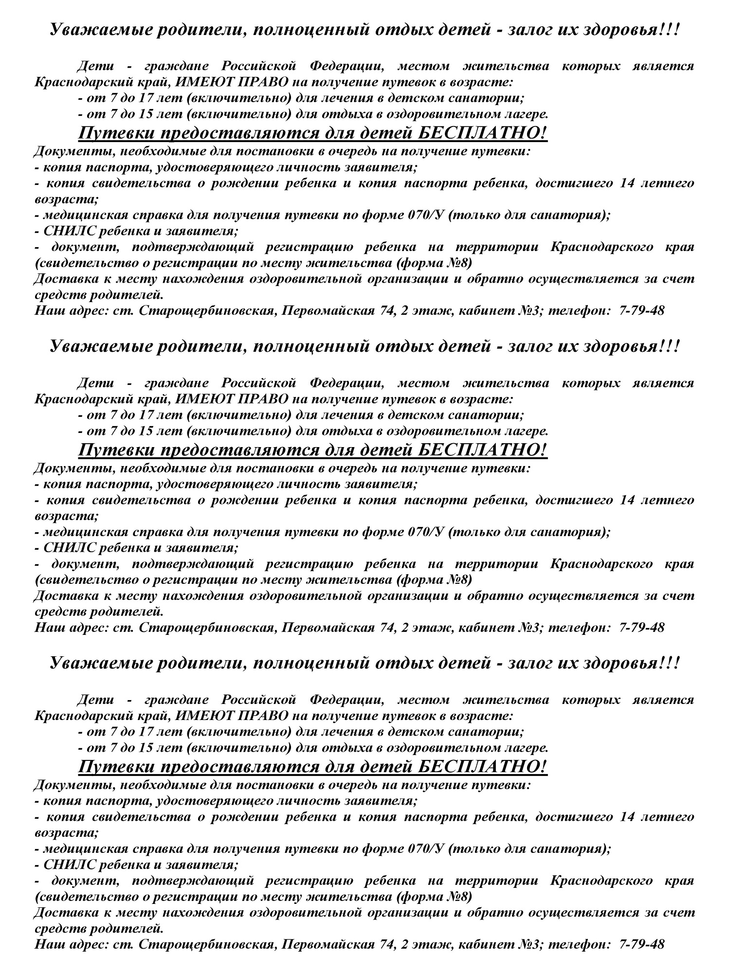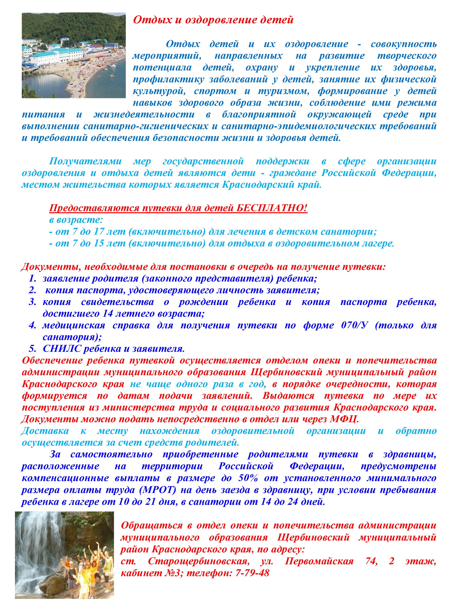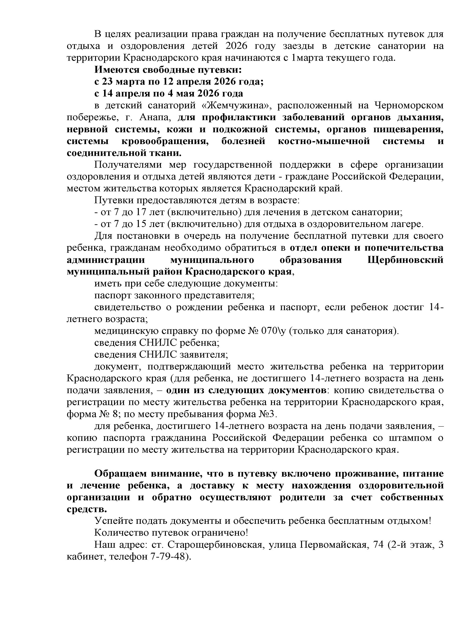 В целях реализации права граждан на получение бесплатных путевок для отдыха и оздоровления детей 2026 году заезды в детские санатории на территории раснодарского края начинаются с 1марта текущего года. Имеются свободные путевки: с 23 марта по 12 апреля 2026 года; с 14 апреля по 4 мая 2026 года в детский санаторий «Жемчужина», расположенный на Черноморском побережье, г. Анапа, для профилактики заболеваний органов дыхания, нервной системы, кожи и подкожной системы, органов пищеварения, системы кровообращения, болезней костно-мышечной системы и соединительной ткани. Получателями мер государственной поддержки в сфере организации оздоровления и отдыха детей являются дети - граждане Российской Федерации, местом жительства которых является Краснодарский край. Путевки предоставляются детям в возрасте: - от 7 до 17 лет (включительно) для лечения в детском санатории; - от 7 до 15 лет (включительно) для отдыха в оздоровительном лагере. Для постановки в очередь на получение бесплатной путевки для своего ребенка, гражданам необходимо обратиться в отдел опеки и попечительства администрации муниципального образования Щербиновский муниципальный район Краснодарского края,  иметь при себе следующие документы: паспорт законного представителя; свидетельство о рождении ребенка и паспорт, если ребенок достиг 14-летнего возраста; медицинскую справку по форме № 070\у (только для санатория). сведения СНИЛС ребенка; сведения СНИЛС заявителя; документ, подтверждающий место жительства ребенка на территории Краснодарского края (для ребенка, не достигшего 14-летнего возраста на день подачи заявления, – один из следующих документов: копию свидетельства о регистрации по месту жительства ребенка на территории Краснодарского края, форма № 8; по месту пребывания форма №3. для ребенка, достигшего 14-летнего возраста на день подачи заявления, – копию паспорта гражданина Российской Федерации ребенка со штампом о регистрации по месту жительства на территории Краснодарского края. Обращаем внимание, что в путевку включено проживание, питание и лечение ребенка, а доставку к месту нахождения оздоровительной организации и обратно осуществляют родители за счет собственных средств. Успейте подать документы и обеспечить ребенка бесплатным отдыхом! Количество путевок ограничено! Наш адрес: ст. Старощербиновская, улица Первомайская, 74 (2-й этаж, 3 кабинет, телефон 7-79-48).